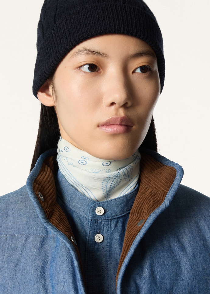 Das Foulard Daisy aus reiner Wolle besticht dank seines klassischen Paisleymotivs mit edlen Leinenblüten durch eine reiche visuelle Nuanciertheit. In der Mitte prangt ein „Loro Piana“-Schriftzug umgeben von kleinen Tröpfchen, um die Komposition mit feinem Understatement abzurunden. Dieses gepflegte Accessoire, das mit handgefertigten Rollsäumen versehen ist, lässt sich um den Hals oder an die Handtasche binden.